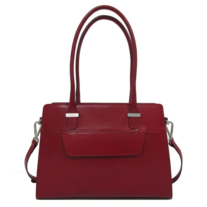 This elegant handbag from Claudio Ferrici is crafted from high-quality Italian leather. The sleek, rectangular design features two long handles, allowing the bag to be carried comfortably in the hand or over the shoulder. There is also a detachable and adjustable shoulder strap for added carrying convenience. On the front is a decorative flap, while the back has a zipper pocket added for safe storage of smaller items. The silver-tone details and neat stitching give the bag a modern, luxurious look. Inside, the main compartment offers plenty of space and several pockets for all your daily essentials.
